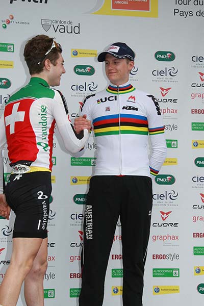 2016 Poignée de main entre Marc IRSCHI 2e et Felix GALL, AUT, 3e de l'Etape Ballaigues - Orbe